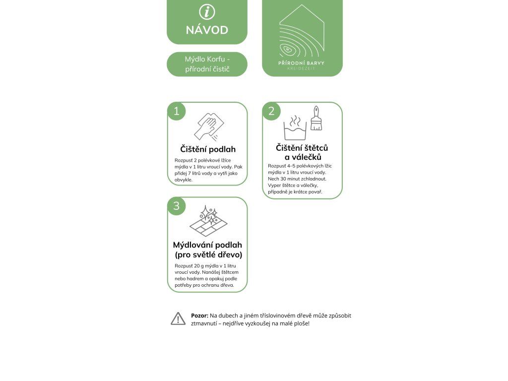 Mýdlo Korfu se už po generace používá jako univerzální čistič v domácnosti a péči o prádlo, k péči o tělo a k plstění vlny. V našem sortimentu slouží jako čistič olejovaných nebo voskovaných povrchů, čistič štětců a válečků znečištěných olejem a k čištění rukou. Je příjemně jemné vůči pokožce a čistí i citlivější povrchy, jako např. mramorové podlahy a spáry.